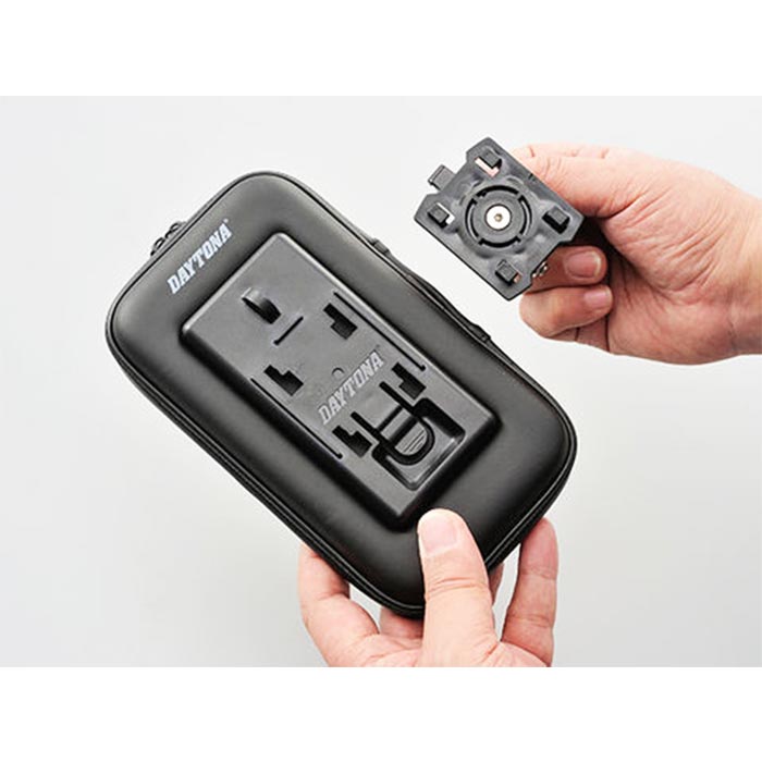 このスマホホルダーのケースは、バイクで走っているときに起こり得る砂埃などの塵や水滴を防ぐディトナオリジナル。スマホを操作する透明部分を大きくしている。さらに走行中にスマホの地図などを見やすいように、ケースの振動を最小にする性能を持っている。ハンドルに取り付けるクランプは、ワンタッチで外せるクイック式、ボルトを使って固定を強めるリジット式の2種類ある。